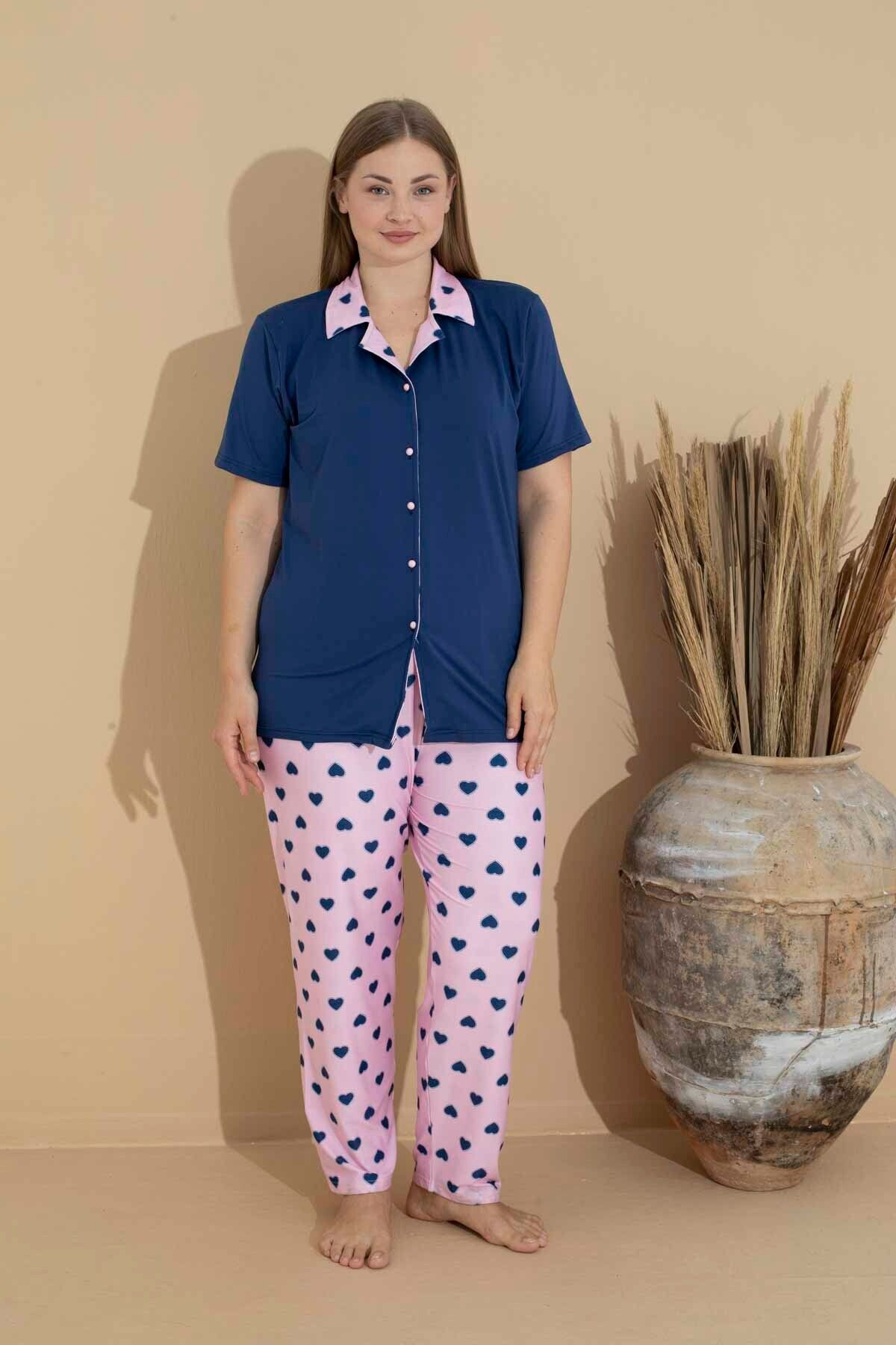 Kadın Battal Milan Kumaş Kısa Kol Gömlek Yaka Büyük Beden Pijama Takımı