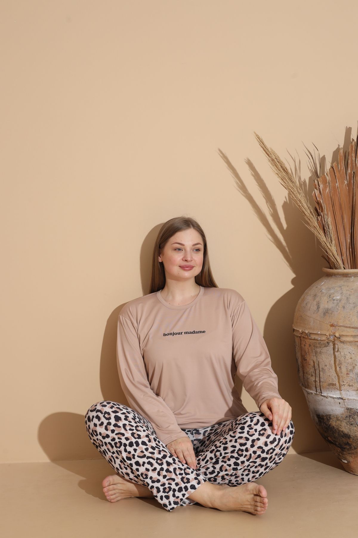 - Büyük beden tasarımıyla her vücut tipine uyum sağlayan Milan Kumaş Pijama Takımı, rahatlığı ve şıklığı bir arada sunar.; - Uzun kollu yapısı ile mevsim geçişlerinde ideal koruma sağlar; serin gecelerde bile sıcak tutar.; - Yüksek bel kesimi sayesinde gün boyu konforlu bir kullanım imkanı tanır ve vücut hatlarını nazikçe sararak rahat hareket etme olanağı verir.; - Homewear koleksiyonuna ait bu pijama takımı, evde geçirilen zamanları daha keyifli hale getirmek için özel olarak tasarlanmıştır.; - Her yaş grubundan kadının tercih edebileceği bu ürün, geniş beden skalasıyla herkes için uygundur.; - İthalatçı firma Boyraz Pijama tarafından güvenle satın alınabilecek olan bu pijama takımı, kalite standartlarına uygun üretilmiştir.; - Pamuklu materyali cildinizle dosttur ve nefes alabilir yapıda olması sayesinde tüm sezon boyunca konforlu hissetmenizi sağlar.; - Alt-üst takım olarak tasarlanmış olan bu set, t-shirt ve pantolon kombiniyle tamamlanmış olup günlük kullanım için pratik bir seçenektir.; - Düz paça tasarımına sahip olan bu pijama pantolonu, modern ve zamansız bir görünüm sunarken uzun paça boyuyla rahatlıkla giyilip çıkartılabilir.; - Sıfır yakaya sahip olan üst parça ise basit ama etkili bir stil oluşturmanızda yardımcı olacaktır.