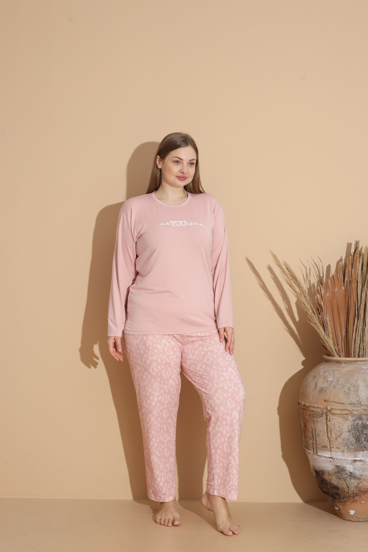 Kadın Battal Milan Kumaş Pijama Takımı Büyük Beden Uzun Kol