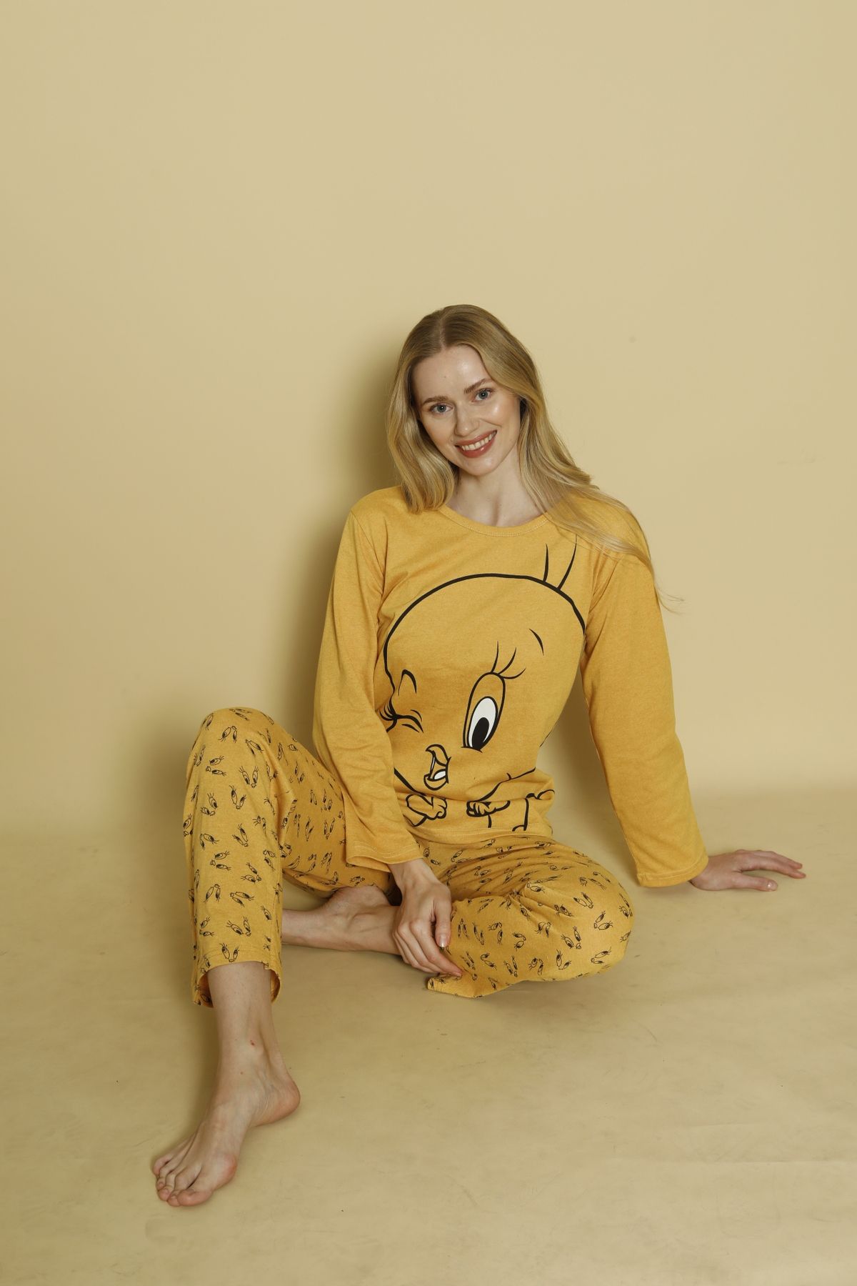 Kadın Penye Sıfır Yaka Uzun Kol Pijama Takımı
